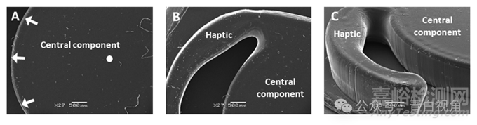 圖5:掃描電子顯微鏡圖像顯示了打印和后固化的人工晶體植入物的特征。左側(cè)是中心組件的俯視圖,白色箭頭突出顯示外邊緣,白色圓圈標(biāo)記該部分的中心 (A)。中間是觸覺部件和中央部件 (B) 之間連接處的俯視圖。右側(cè)是中心部分和植入物觸覺之一的斜角圖像。請(qǐng)注意,該圖像捕獲了中心組件和觸覺 (C) 的垂直邊緣。