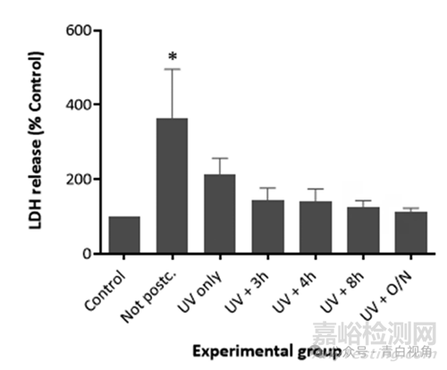 研究了后固化過程對(duì)打印類晶狀體模型生物相容性的影響體外。未進(jìn)行后固化或已經(jīng)歷不同階段的后固化方案的樣品與 FHL-124 晶狀體細(xì)胞共孵育 48 小時(shí)體外。在此時(shí)間段之后,進(jìn)行LDH測(cè)試。在未使用后固化聚合物孵育的細(xì)胞中檢測(cè)到培養(yǎng)基中 LDH 濃度最高。這些水平與對(duì)照顯著不同,正如方差分析和 Tukey 測(cè)試所證實(shí)的那樣(p ?0.05)。圖6結(jié)果表明,當(dāng)細(xì)胞在經(jīng)過紫外線后固化的聚合物存在下培養(yǎng)時(shí),LDH 水平顯著下降。當(dāng)裝置在經(jīng)歷紫外線照射步驟后在真空中加熱時(shí),細(xì)胞死亡水平似乎進(jìn)一步降低,使得細(xì)胞死亡與僅細(xì)胞對(duì)照細(xì)胞沒有顯著不同。還觀察到熱處理持續(xù)時(shí)間的增加導(dǎo)致植入物的毒性降低。當(dāng)聚合物裝置在紫外線照射后加熱過夜時(shí),檢測(cè)到最低的細(xì)胞毒性。在該實(shí)驗(yàn)組中,細(xì)胞死亡水平與僅細(xì)胞的陰性對(duì)照相當(dāng)。因此,得出的結(jié)論是,必須用紫外線照射裝置 1 小時(shí)并在真空中加熱過夜,以盡量減少這些裝置引起的毒性。