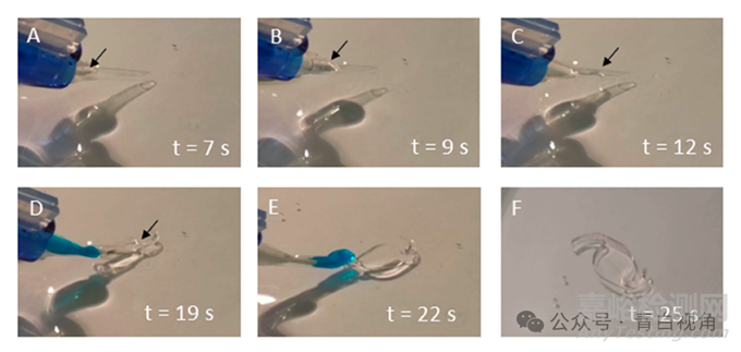 圖7。數(shù)字視頻的多個(gè)幀顯示了從手術(shù)注射器中輸送類似透鏡的 3D 物體。前三張圖像 (A–C) 顯示了原型(用箭頭表示),位于注射器內(nèi)部并被輸送到水介質(zhì)中。植入物從注射器釋放后展開(D,E),直到恢復(fù)其原始形狀(F)。