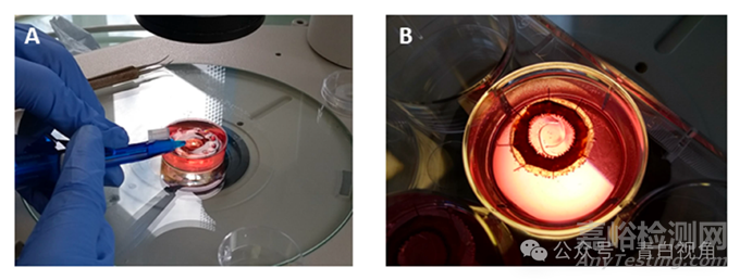 圖8:數(shù)字圖像顯示了在體外人類囊袋模型中植入打印的類IOL裝置的過程。圖像(A)中可以看到植入物遞送到囊袋中的過程。一旦植入囊袋,植入物恢復(fù)了其原始形狀,并且沒有引起囊袋的任何變形(B)。