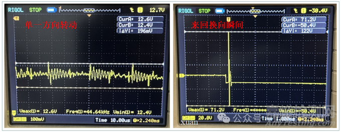 2.硬件+軟件:硬件方面需要確保單一方向轉(zhuǎn)動時,電機的EMC噪聲是滿足測試且余量充足的,再通過調(diào)整軟件程序,減小切換速度、增長切換時間、降低切換頻率等這些方面降低電機換向時產(chǎn)生的反向電動勢的次數(shù),來規(guī)避高頻次的瞬態(tài)電動勢形成的噪聲問題;