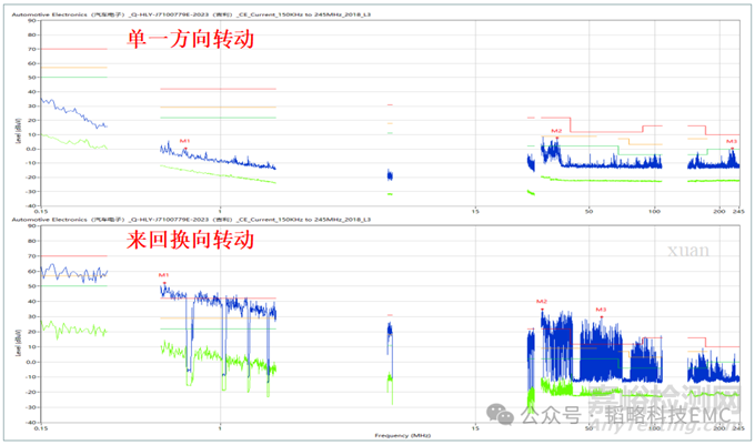 2.電機換向時產(chǎn)生的反向電動勢;在諸多換向類電機測試EMC的時候,都會發(fā)現(xiàn)單一方向轉(zhuǎn)動的時候,電機噪聲都十分平穩(wěn),但是加上“往返”也就是換向后,電機噪聲顯的十分明顯。下圖是某車載座艙同一電機,在“單一方向轉(zhuǎn)動”與“來回換向轉(zhuǎn)動”兩種方式下測試出來的電流法數(shù)據(jù)。