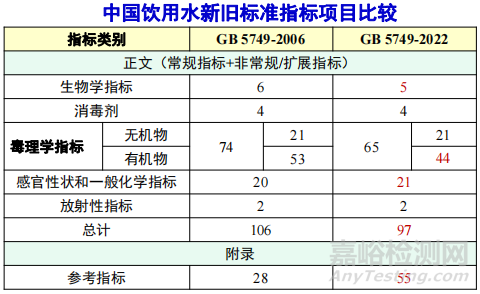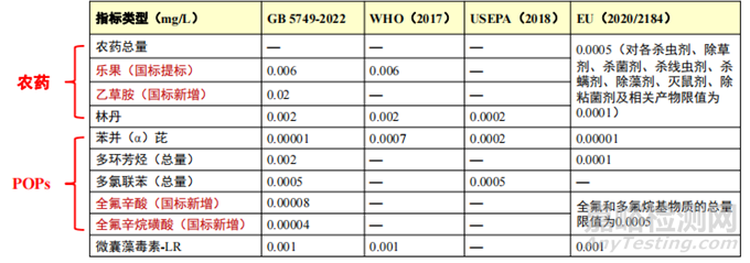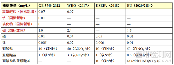 新國標增加了3項無機毒理指標。美國和歐盟除分別規(guī)定了硝酸鹽和亞硝酸鹽的限值外,還限定了二者的總值。
