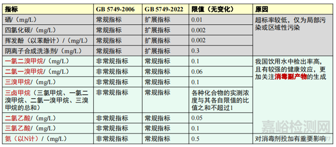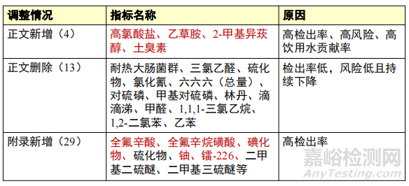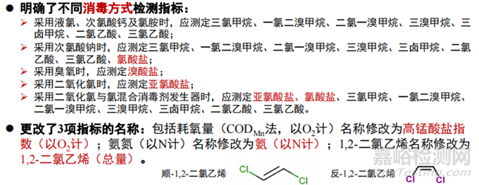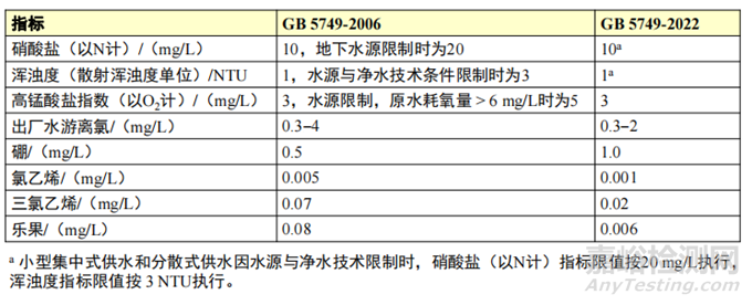 此外,《生活飲用水衛(wèi)生標準》還有其他變化,例如:明確了不同消毒方式檢測指標、更改了3項指標的名稱、刪除了小型集中式供水和分散式供水部分水質指標及限值的暫行規(guī)定等。