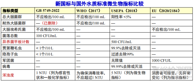 飲用水微生物安全不只是與糞便污染有關,有些微生物(如軍團菌)在供水管道中生長,而其他一些則在水源水中生長(如麥地那龍線蟲),可引起疫情暴發(fā)和一些散發(fā)病例。通過新國標與國外水質標準微生物指標比較發(fā)現(xiàn),異養(yǎng)菌本身不會影響人體健康,但異養(yǎng)菌平板計數(shù)可作為細菌消毒效率和管網(wǎng)清潔的指示標準。美國把渾濁度列為微生物指標,不僅僅將其局限在感官上,更重視其作為細菌和病毒載體的屬性。