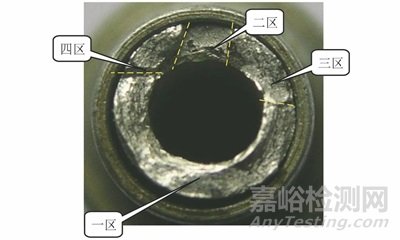 將導(dǎo)管斷口置于體視鏡下觀察發(fā)現(xiàn),導(dǎo)管斷口磨損嚴(yán)重,斷面被擠壓碾平嚴(yán)重,斷口整體較粗糙;從不同的高度與平整度以及放射棱線的走向可將斷面分成4個區(qū)域,一區(qū)大約占斷口總面積的60%,二區(qū)約占10%,三區(qū)約占18%,四區(qū)約占12%;斷口上未見明顯冶金缺陷及腐蝕產(chǎn)物。斷口處宏觀形貌如圖3所示。