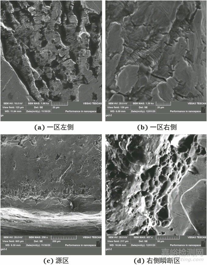 二區(qū)斷口較為平坦,磨損較輕,最上端為裂紋源區(qū),源區(qū)附近可見扇形區(qū)域,并有少量放射棱線,擴(kuò)展區(qū)可見明顯疲勞條帶。裂紋最終擴(kuò)展至三區(qū)、四區(qū),連接形成臺階斷裂,斷口形貌特征如圖5所示。