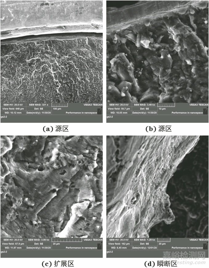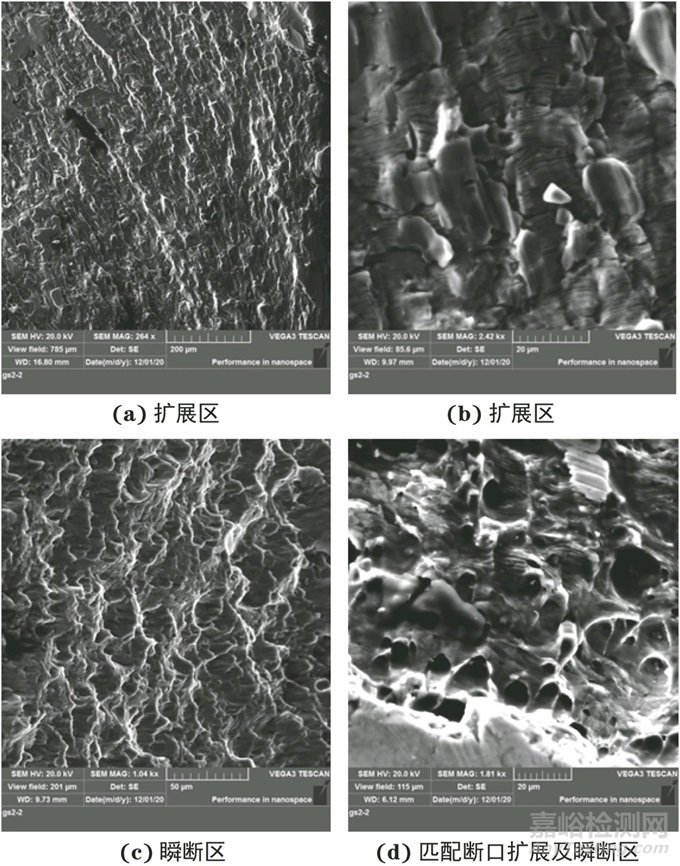 三區(qū)斷面幾乎全被磨損,匹配斷口磨損較輕微,從匹配斷口觀察可見明顯的擴(kuò)展棱線,裂紋從外表面處沿周向及向內(nèi)擴(kuò)展,最終瞬斷區(qū)呈韌窩狀斷裂,斷口形貌特征如圖6所示。