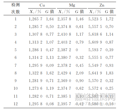 首先進行離群值檢驗。檢測員A使用直讀光譜儀對未知樣品進行12次測試,采用格拉布斯(Grubbs)檢驗法對每個元素測試數(shù)據(jù)進行離群值檢驗,如果識別出離群值,則從數(shù)據(jù)中刪除該測試值,并在該離群位置附近進行2個替換測試。