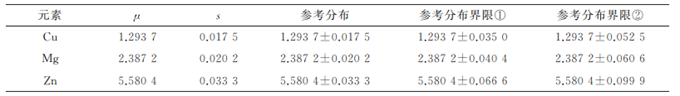 AC7101/1GΔ2版附錄D.3規(guī)定,每個元素的參考分布為μ±s,參考分布界限①為μ±2s,參考分布界限②為μ±3s。各元素的參考分布及參考分布界限見表2。