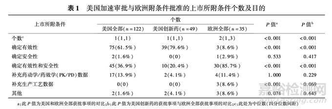 美國(guó) FDA 對(duì) 122 個(gè)獲批事項(xiàng)提出了 143 個(gè)上 市所附條件,平均 1. 2 個(gè) / 獲批事項(xiàng)( 最少 1 個(gè),最多 4 個(gè)),其中對(duì) 49 個(gè)創(chuàng)新藥對(duì)應(yīng)的獲批事項(xiàng)提出了 65個(gè)上市所附條件,平均1.3個(gè)·獲批事項(xiàng)-1(最少 1個(gè),最多4個(gè))。歐洲EMA對(duì)35個(gè)獲批事項(xiàng)提出 了 80 個(gè)上市所附條件,平均為 2. 3 個(gè)·獲批事項(xiàng) - 1 ( 最少 1 個(gè),最多 6 個(gè)) 。 歐洲附條件批準(zhǔn)上市所附 條件個(gè)數(shù)明顯高于美國(guó)(P <0. 001)。