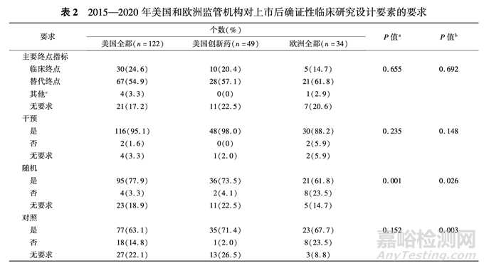 美國(guó)和歐洲分別對(duì) 18. 9% 和 14. 7% 的上市后 確證性臨床研究未提出是否隨機(jī)的要求,對(duì) 22. 1% 和 8. 8% 的未提出是否設(shè)置對(duì)照的要求,對(duì) 59. 0% 和 14. 7% 的未提出是否使用盲法的要求。 美國(guó)和 歐洲監(jiān)管機(jī)構(gòu)對(duì)上市后確證性臨床研究設(shè)計(jì)要素的 要求見表 2。