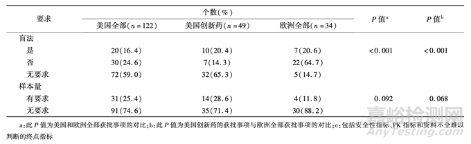 2 監(jiān)管機(jī)構(gòu)要求的上市后確證性臨床研究本研究中,除歐洲有 1 個(gè)獲批事項(xiàng)的批文未要 求開展上市后研究之外(EMEA/H/C/004554/0000, Ervebo,適用于 18 歲及以上高危人群的主動(dòng)免疫, 以預(yù)防扎伊爾埃博拉病毒引起的埃博拉病毒病,上 市所附特定條件均為補(bǔ)充生產(chǎn)工藝數(shù)據(jù)),其他的 均對(duì)上市后研究提出了要求。 按照本研究定義,為 美國(guó)的 122 個(gè)獲批事項(xiàng)和歐洲的 34 個(gè)獲批事項(xiàng)分別 篩選了 122 個(gè)和 34 個(gè)上市后確證性臨床研究,并根據(jù)審評(píng)文件中的文字描述研究了監(jiān)管機(jī)構(gòu)的要求。 美國(guó)和歐洲對(duì)大部分(美國(guó) 82.8%,歐洲 79. 4% )的上市后確證性臨床研究均明確要求了使 用的主要終點(diǎn)指標(biāo),但其中僅有 24. 6% (美國(guó))和 14.7%(歐洲)要求使用臨床終點(diǎn)。 美國(guó)和歐洲分別要求 95. 1% 和 88. 2% 的上市后確證性臨床研究使用 干預(yù),77. 9% 和 61. 8% 的使用隨機(jī),63. 1% 和 67. 7% 的使用對(duì)照,16. 4% 和 20. 6% 的使用盲法,對(duì) 25. 4% 和 11. 8% 要求了樣本量。 在對(duì)樣本量有要求的獲 批事項(xiàng)中,美國(guó)和歐洲均包含對(duì)樣本量的定量要求, 如“至少124名直結(jié)腸癌患者”、“大約200人”、“至 少 25 個(gè)兒童”等;也包含定性要求,如“能代表某腫 瘤類型的足夠數(shù)量患者” 等。