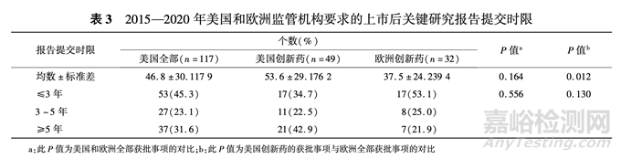 美國(guó)對(duì) 119 個(gè)(97. 5% ) 上市后確證性臨床研究 要求了研究報(bào)告提交時(shí)間,其中有 117 個(gè)(95. 9% ) 的 時(shí)間晚于加速審批時(shí)間,上市后研究報(bào)告提交時(shí)限 平均為 46. 8 個(gè)月(最短 1 個(gè)月,最長(zhǎng) 169 個(gè)月),≥5 年的占 31. 6% 。 其中,美國(guó)創(chuàng)新藥的上市后確證性 臨床研究報(bào)告提交時(shí)限平均為 53. 6 個(gè)月(最短 6 個(gè)月,最長(zhǎng)117個(gè)月),≥5年的占42.9%。 歐洲對(duì)32 個(gè)(94. 1% )上市后確證性臨床研究要求了研究報(bào) 告提交時(shí)間,平均時(shí)限為 37. 5 個(gè)月( 最短 1 個(gè)月,最 長(zhǎng) 88 個(gè)月,明顯短于美國(guó)創(chuàng)新藥),≥5 年的占 21.9%。 美國(guó)和歐洲監(jiān)管機(jī)構(gòu)要求的上市后關(guān)鍵研 究報(bào)告提交時(shí)限見表 3。