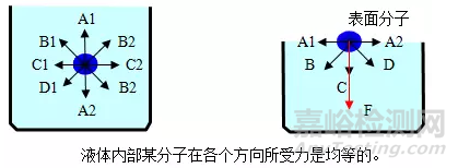 液體表面某分子所受的各個(gè)方向的吸引力,其中A1、A2的力可以互相抵消,C向力及B、D向下的合力為F,B、D水平分力也互相抵消,所以分子受到一個(gè)垂直于液體表面指向液體內(nèi)部的”合吸力”,通常稱為凈吸力,由于有凈吸力的存在,致使液體表面的分子有被拉入液體內(nèi)部的傾向,所以任何液體表表都有自發(fā)縮小的傾向,這也是液體表面表現(xiàn)出表面張力的原因。