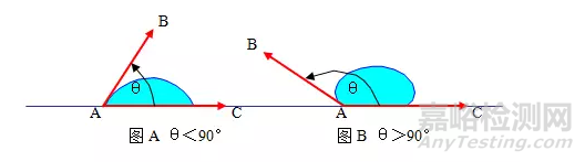 液體對(duì)固體的潤(rùn)濕程度,通常用液-固二相的接觸界面AC與液體表面的切線AB之間的夾角(稱接觸角)的大小來表示。