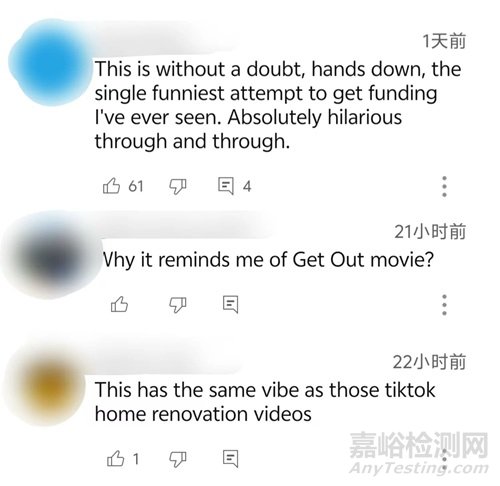 視頻評(píng)論截圖:「這是我見(jiàn)過(guò)的最搞笑的融資嘗試」「為什么讓我想起了《逃出絕命鎮(zhèn)》」「好像看到的裝修視頻」