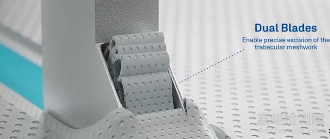 該設(shè)備的專有坡道有助于提升和拉伸小梁網(wǎng),而雙刀片穿透小梁網(wǎng),并創(chuàng)建精確的平行切口,控制切除。