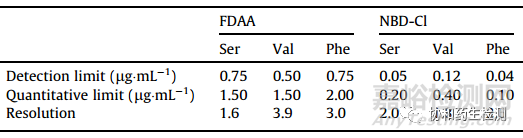 綜上所述,作者開發(fā)了一種檢測一系列L-氨基酸對映異構(gòu)體純度的高效液相色譜法。方法以NBD-Cl柱前衍生氨基酸以提高檢測靈敏度,衍生后的氨基酸對映異構(gòu)體通過手性柱分離,流動相含0.1%檸檬酸的甲醇-乙腈(1:1)溶液,流速:0.5ml/min。檢測波長:470nm。11對氨基酸異構(gòu)體均可分離。在L-氨基酸大量過量的前提下,仍可對微量的D-氨基酸(0.5%)異構(gòu)體進(jìn)行定量。該方法經(jīng)過專屬性、精密度、線性、定量限、檢出限、準(zhǔn)確度驗證,并成功應(yīng)用于大量樣本的檢測。