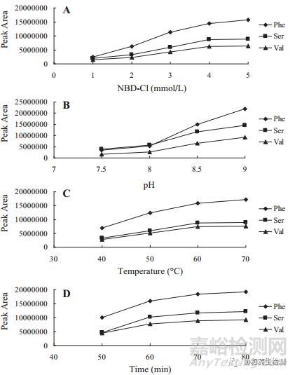 (A:衍生試劑的濃度 B:衍生試劑的pH C:反應(yīng)溫度 D:反應(yīng)時間)