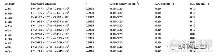 線性、檢出限、定量限結(jié)果如表2所示,D-氨基酸濃度范圍0.40-3.20μg/ml,均溶于濃度為80.00μg/ml的L-氨基酸溶液中。結(jié)果所有待測氨基酸線性曲線,相關(guān)系數(shù)r>0.9975,定量限均高于0.40μg/ml。