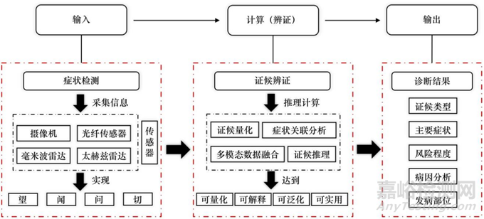 近年來(lái),隨著信息技術(shù)的不斷發(fā)展,人工智能輔助中醫(yī)辨證作為一種新興的現(xiàn)代醫(yī)學(xué)技術(shù)得到了越來(lái)越多的關(guān)注和應(yīng)用。人工智能輔助中醫(yī)辨證將傳統(tǒng)中醫(yī)的辨證理論與現(xiàn)代計(jì)算機(jī)技術(shù)和人工智能技術(shù)相結(jié)合,以更好地解釋疾病的本質(zhì)和發(fā)展規(guī)律,實(shí)現(xiàn)更加客觀、精準(zhǔn)的中醫(yī)診斷。人工智能輔助中醫(yī)辨證的具體框架描述如圖2所示,通過(guò)傳感器等智能設(shè)備采集和分析患者的癥狀、體征、舌象、脈象等多維多模數(shù)據(jù),實(shí)現(xiàn)傳統(tǒng)中醫(yī)辨證中“望、聞、問(wèn)、切”的信息采集過(guò)程。在完成信息的“輸入”階段后,人工智能輔助中醫(yī)辨證的核心在于“計(jì)算”階段,即讓機(jī)器學(xué)習(xí)和理解中醫(yī)的知識(shí)體系,以形成機(jī)器“辨證”機(jī)制,達(dá)到辨證過(guò)程可解釋、辨證結(jié)果可量化、辨證模型可泛化以及可實(shí)用的目的。最終,機(jī)器可以基于這些學(xué)習(xí)到的知識(shí),給出精準(zhǔn)且客觀的辨證結(jié)果,完成“輸出”階段。
