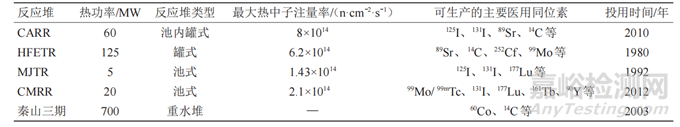 目前,我國除秦山三期核電站的2座重水商業(yè)核電反應(yīng)堆以外,在役且可用于醫(yī)用同位素生產(chǎn)的研究堆主要包括中國原子能科學(xué)研究院的中國先進(jìn)研究堆(CARR)及49-2游泳池堆、中國核動力研究設(shè)計院的高通量工程試驗堆(HFETR)及岷江試驗堆(MJTR)和中國工程物理研究院的中國綿陽研究堆(CMRR)。目前,我國生產(chǎn)醫(yī)用同位素的主要反應(yīng)堆情況如表 1 所示。① 中國原子能科學(xué)研究院于 1958 年首次投運了重水反應(yīng)堆,并成功研制出了33種反應(yīng)堆產(chǎn)放射性同位素,這是我國同位素技術(shù)應(yīng)用的開端。2012年,CARR成功實現(xiàn)滿功率運行,利用該堆輻照氮化鋁(2466.4 g,365 d),生成了百居里級的14C(99.43 Ci)。目前,中國原子能科學(xué)研究院正積極開展使用低濃鈾制備千居里級醫(yī)用裂變99Mo和使用間歇循環(huán)回路法制備百居里級125I 的工藝研究。② 自 20 世紀(jì) 80 年代起,中國核動力研究設(shè)計院利用其擁有的 HFETR(125 MW) 和 MJTR (5 MW) 生 產(chǎn) 了131I、 125I、32P、89Sr等放射性同位素,但目前利用HFETR僅實現(xiàn)了小批量89Sr的市場供給。③ 中國工程物理研究院核物理與化學(xué)研究所依托 CMRR 已實現(xiàn)了131I和177Lu的自主化生產(chǎn)與穩(wěn)定供給,建成了國內(nèi)唯一的裂變