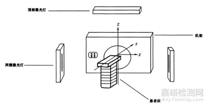 移動式激光定位設備:安裝在X、Y、Z方位的激光燈組通過手動或者遙控調(diào)節(jié),可分別投射出相互垂直共面的矢狀面、冠狀面和橫斷面激光線,控制裝置按照模擬定位系統(tǒng)確定的擺位坐標驅(qū)動激光燈組移動到定位點,并在患者體表兩側(cè)及上表面顯示出“十”字標記點,以便放射治療時對患者病灶進行定位。