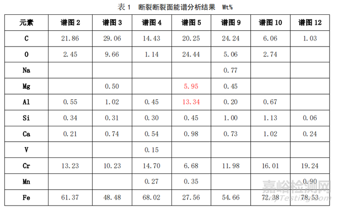 又經(jīng)多點(diǎn)能譜分析斷裂面化學(xué)成分,僅發(fā)現(xiàn) 1 點(diǎn)(譜圖 5)存在 Al、Mg 氧化物夾雜,其他未見明顯異常,結(jié)果見表 1。