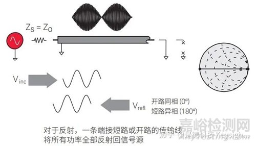 當(dāng)傳輸線用短路端接時(shí)(短路不能維持電壓,因而耗散功率為零),反射波會(huì)沿傳輸線返回 到信號(hào)源(圖 5)。在負(fù)載平面處,反射電壓波的幅度必然等于入射電壓波幅度,而相位則 相差 180°。反射波與入射波幅度相等,但方向相反。