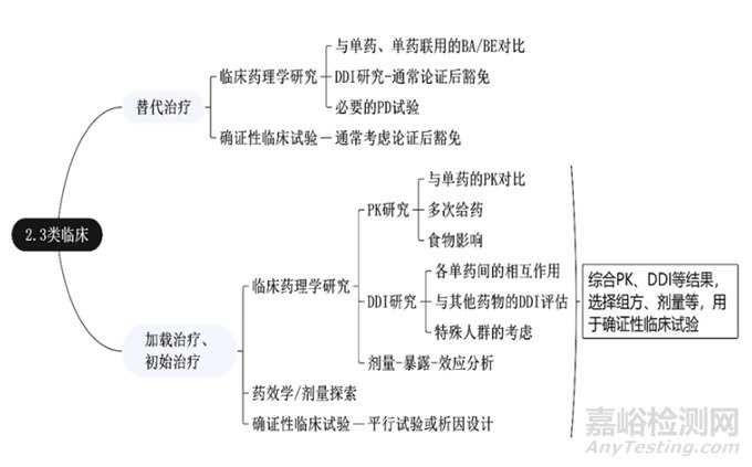 由于單藥間作用機(jī)制的相加、協(xié)同,不良反應(yīng)的抵消等效果,可以通過2.3類新復(fù)方的開發(fā)獲得更高有效性和/或安全性的臨床優(yōu)勢。加載治療和初始治療通常以提高安全性和/或有效性為開發(fā)目標(biāo)。其臨床研究主要包括:充分的PK研究、DDI研究、探索性研究,并選擇最優(yōu)組方和劑量完成確證性臨床試驗。