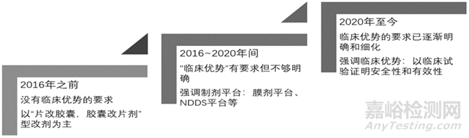 在2016年《化學(xué)藥品注冊分類改革方案》明確改良型新藥定義后,其研發(fā)申報迎來爆發(fā)式增長,但同時也暴露了大量產(chǎn)品臨床優(yōu)勢不明顯,同質(zhì)化競爭嚴(yán)重的問題。在2020年《化學(xué)藥品改良型新藥臨床試驗技術(shù)指導(dǎo)原則》進(jìn)一步對臨床優(yōu)勢的要求進(jìn)行了明確。以這兩款關(guān)鍵法規(guī)的頒布為標(biāo)志,其發(fā)展大致分為3個階段,如圖1所示。