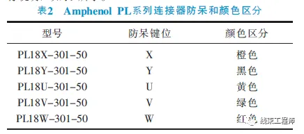 5) 連接器要帶有機械防呆功能,同時,不同型號規(guī)格在顏色上也能加以區(qū)分;以Amphenol PL系列連接器為例進行說明,如表2所示。