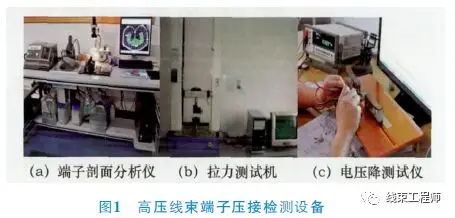 端子剖面分析儀,用于分析端子壓著端面導(dǎo)線分布壓接情況。拉力測試機,用于測試驗證端子壓緊情況。電壓降測試儀,用于檢測端子壓著后接觸性能阻抗。