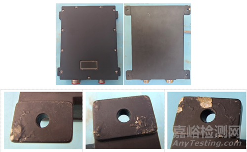 宏觀外觀上看,試驗件外殼的表面未出現(xiàn)明顯腐蝕現(xiàn)象,底面四角出現(xiàn)涂層起泡、脫落現(xiàn)象,如圖 3所示。將電子控制器的機(jī)箱蓋板打開,機(jī)箱蓋板的屏蔽條出現(xiàn)數(shù)處斷裂,對內(nèi)部印制電路板與元器件進(jìn)行觀察,與試驗前進(jìn)行對比,內(nèi)部的元器件未發(fā)現(xiàn)腐蝕現(xiàn)象,試驗過程中外殼和機(jī)箱蓋板屏蔽條起到了良好的密封作用。