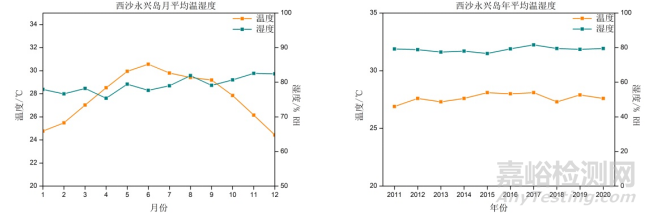 圖 5 西沙永興島年、月平均溫濕度變化曲線