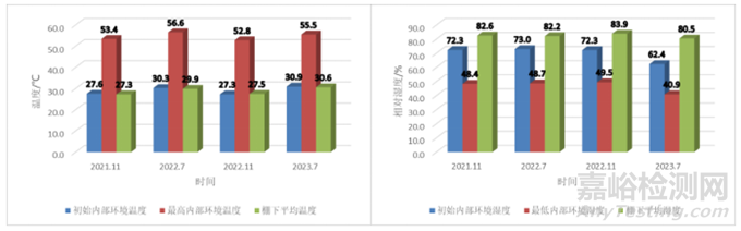 通過在電子控制器內(nèi)部安裝溫濕度傳感器,收集電子控制器在通電工作下的內(nèi)部環(huán)境溫濕度數(shù)據(jù),與外部自然環(huán)境數(shù)據(jù)進(jìn)行對比分析。由于在熱帶海洋環(huán)境下,無明顯四季變化,常年高溫高濕,高鹽霧。通過收集西沙永興島十年的溫濕度數(shù)據(jù),得到西沙永興島的年平均溫度27.6℃,年平均相對濕度78.8%,其年平均溫濕度,月平均溫濕度變化趨勢如圖 5所示。