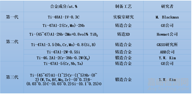 早在50年代初期,美國學者即對Ti-50Al二元合金的性能進行了研究,發(fā)現(xiàn)合金具有優(yōu)異的高溫性能,但因合金的室溫塑性太差而放棄。1975-1982年,美國P&W空軍實驗室的M. Blackburn 教授通過對近百種成分的TiAI合金加以研究,發(fā)展了第一代TiAI合金,即Ti-48Al-1V-0.3C (at. % ),其室溫塑性可高達2%。80年代末,美國GE司Huang博士發(fā)展了第二代TiAI合金 ( Ti-48 Al-2Cr-2Nb ),并證明了其良好的綜合性能,由此引起了對TiAI合金世界范圍的廣泛興趣。后又經(jīng)過大量研究,已發(fā)展了三代TiAI合金(見表1)。目前正研究具有更高耐熱溫度的第四代甚至第五代TiAI合金。