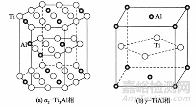 TiAI合金中最主要的相有兩種:α2相及γ相。α2相是DO19(有序六方)結構(見圖2a),隨著溫度的不同,鋁的含量介于22%和39%之間。γ-TiAI相是L1o(有序面心四方)結構(見圖2b),隨著溫度的不同,鋁含量介于48.5%和66%之間。對于理想配比的化合物,其晶格常數(shù)軸比c/a等于1.105;隨著鋁含量的增加,這個四面體比值升至1.03,隨著鋁含量的減少,又可降為1.01。對于遠離理想配比的成分,過量的鈦或鋁原子相互占位,但不產(chǎn)生空位。