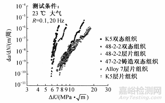 TiAI合金的疲勞裂紋擴展行為對組織很敏感,但受合金成分少量變化的影響不大,如圖5所示。由于片層組織特有的導致裂紋偏斜、橋接等機制,片層組織相對雙態(tài)組織、近片層組織具有較高的斷裂韌性。