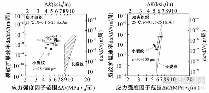 TiAI合金的疲勞裂紋擴展行為依賴于裂紋尺寸的大小,裂紋分為可長大(長裂紋)和不可長大(短裂紋)兩種。長裂紋的長大規(guī)律有門檻值、Paris裂紋擴展率和發(fā)生斷裂的Kc值。由短裂紋引起的疲勞塑性區(qū)相對來講非常大,裂紋尺寸相當小。