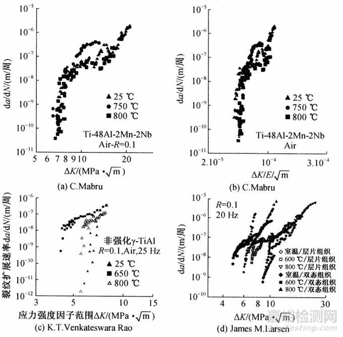 TiAl合金在低溫下表現(xiàn)出極為有限的亞臨界裂紋擴展。在受限制的損傷容限范圍內(nèi),需要了解是純機械疲勞作用下所加載荷的循環(huán)分量引發(fā)亞臨界裂紋擴展斷裂,還是外加波動載荷下的裂紋擴展只是所加載荷中靜平均應力促進穩(wěn)態(tài)斷裂??捎貌煌椒ù_定△K影響的循環(huán)載荷對裂紋擴展的貢獻,是應力幅△K決定了整個裂紋擴展速率。