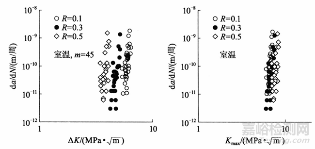 圖5 不同應力比下△K值和Kmax:對疲勞裂紋擴展速率的影響