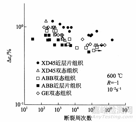 研究發(fā)現(xiàn)合金的成分和顯微組織直接影響合金的低周疲勞性能。低周疲勞抗力主要受屈服強度的影響,塑性對其也具有一定程度的影響,歸根到底這些性能還是受組織參數(shù)的控制。