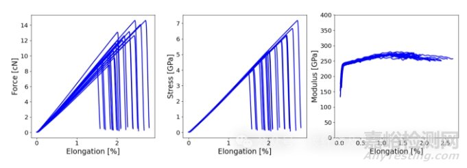 以碳纖維單絲力學(xué)性能測(cè)試為例,對(duì)同一根碳纖維單絲的橫截面和拉伸強(qiáng)度的組合測(cè)量可以將力-伸長(zhǎng)率曲線直接轉(zhuǎn)化為應(yīng)力-伸長(zhǎng)率曲線。這是通過(guò)將每根碳纖維的單個(gè)橫截面的cN力歸一化來(lái)完成的,以在拉伸測(cè)試過(guò)程中接受以GPa表示的應(yīng)力。同樣,這些應(yīng)力-伸長(zhǎng)率曲線的導(dǎo)數(shù)也可以直接以GPa為單位獲得,從而可以立即測(cè)量。