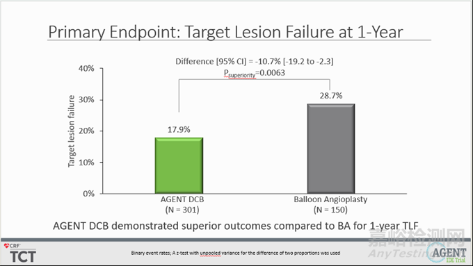 結(jié)果顯示,12個月時達(dá)到了靶病變失?。═LF)的主要終點。Agent DCB 組1年時靶病變失敗率較BA組顯著降低(17.9% vs. 28.7%,P=0.0063,),提示Agent DCB 在減少靶病變失敗率上顯著優(yōu)于BA。