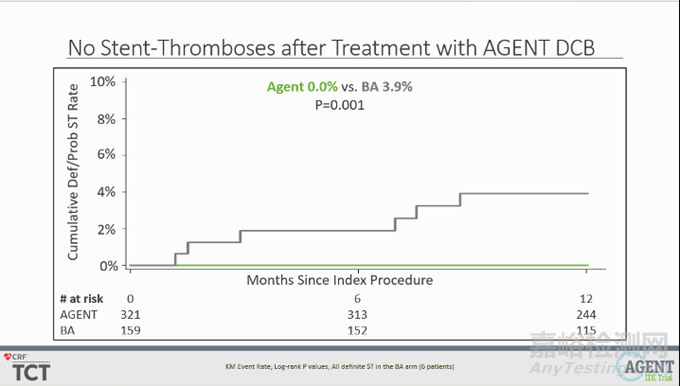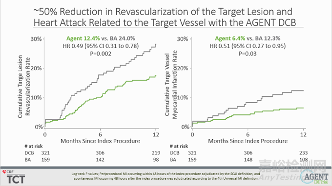 與 BA 相比,應(yīng)用 Agent DCB 使累積靶病變血運(yùn)重建風(fēng)險顯著降低51%(12.4% vs. 24.0%,P=0.002),與靶血管相關(guān)的心臟病發(fā)作風(fēng)險顯著降低49%(6.4% vs. 12.3%,P=0.03);且無支架血栓形成發(fā)生(0.0% vs. 3.9%,P=0.001)。