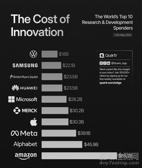 數(shù)據(jù)平臺Quartr公布了全球研發(fā)投入前十名的企業(yè)名單。