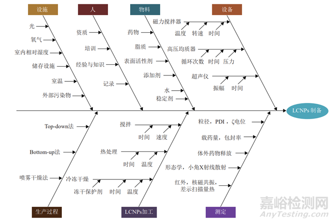 WAGHULE 等 [34] 基于 QbD 原理評(píng)估并定義了 LCNPs 的 CQAs,包括晶型、粒徑和粒度分布、ζ 電位、黏度、包封率等。構(gòu)建魚(yú)骨圖 ( 圖 2) 對(duì)LCNPs 制備過(guò)程中的各種問(wèn)題、影響及結(jié)果進(jìn)行分析,從原料、設(shè)備、制備方法等 7 個(gè)方面識(shí)別了各種可能對(duì)制備過(guò)程產(chǎn)生影響的風(fēng)險(xiǎn)來(lái)源。在風(fēng)險(xiǎn)識(shí)別分析后,研究者通過(guò) FMEA 法和使用基于相對(duì)風(fēng)險(xiǎn)的矩陣分析法,對(duì)影響 CQAs 的關(guān)鍵物料屬性(critical material attributes,CMAs) 和關(guān)鍵工藝參數(shù)(critical process parameters,CPPs) 進(jìn)行評(píng)估,確定了對(duì) LCNPs 具有高風(fēng)險(xiǎn)的相關(guān)變量,如 CMAs 中API 的相對(duì)分子質(zhì)量、pKa、晶型、粒徑和粒度分布等,CPPs 中的混合溫度以及超聲振幅等。在實(shí)驗(yàn)設(shè)計(jì)(DoE) 中,建議采用全因子實(shí)驗(yàn)設(shè)計(jì)、部分析因?qū)嶒?yàn)設(shè)計(jì)、Plackett-Burman 設(shè)計(jì)等方法,建立輸入和輸出變量之間的數(shù)學(xué)關(guān)系,在此基礎(chǔ)上確立相應(yīng)的設(shè)計(jì)空間,為物料特性和工藝參數(shù)的選擇提供更寬泛的操作面,從而對(duì)于 LCNPs 的整個(gè)制備過(guò)程形成完備理解和全面控制。