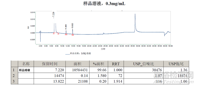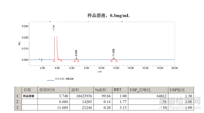 樣品溶液的面積%數(shù)據(jù)與方法一一致。在11.4分鐘處檢測到的峰可能是二氯-雜質(zhì)B,但需要通過保留標記進行確認。在13.8分鐘處檢測到的峰是未知峰。